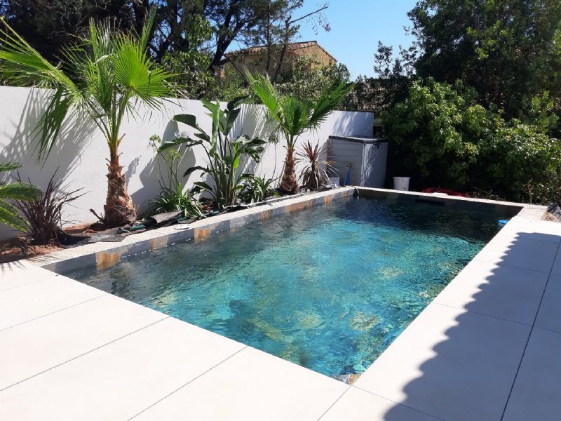 Terrasse épousant la piscine 6 x 3 m, arrosage automatique, garage carrelé.